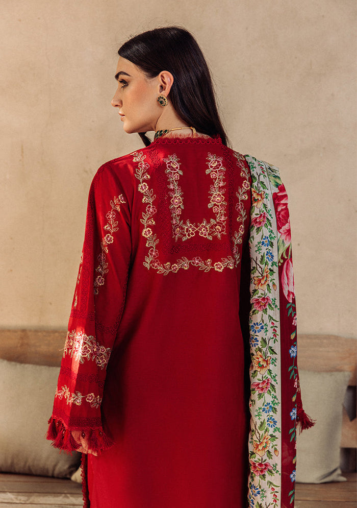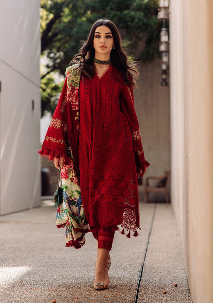 The resplendence of our Roise outfit in dark red tone on lawn portrays the richness of schiffli. This bold piece with a silk printed dupatta whispers glamour