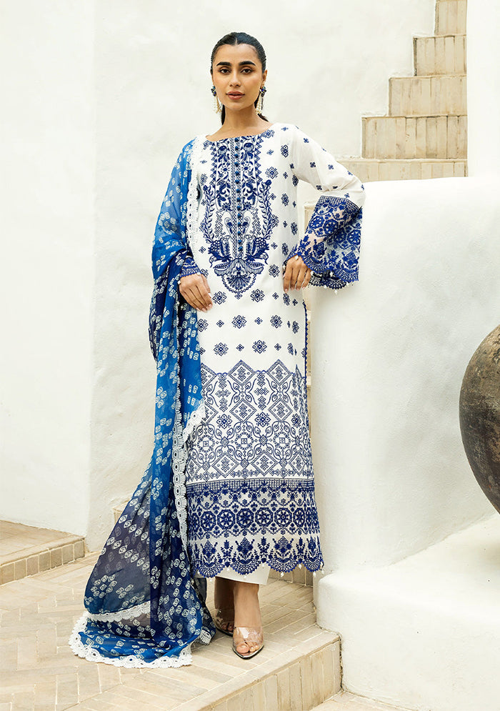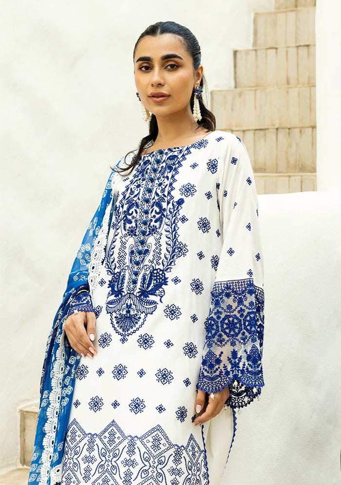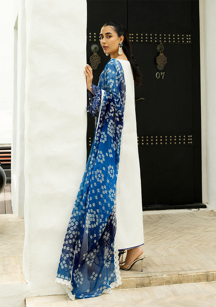 Experience the luxurious feel of this blue and white chikankari set. This blue and white chikankari suit features bold blue embroidery against a clean white canvas. The strategically placed chikankari work draws the eye, highlighting the neckline, sleeves, and hemline. The detailed patterns create a beautiful contrast, adding a touch of drama to the classic design. Paired with a blue chunri dupatta.